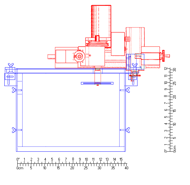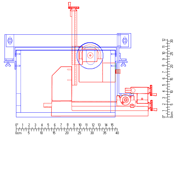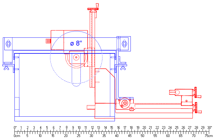 The maximum width of cut (between the blade and the fence) is proportional to the length of the saw arbor. The actual drawing fit a mill cutter arbor, 1-3/4" long and a 4" diameter saw blade. Use the printed rulers to have a rough idea of the sizes (they are not very precise).