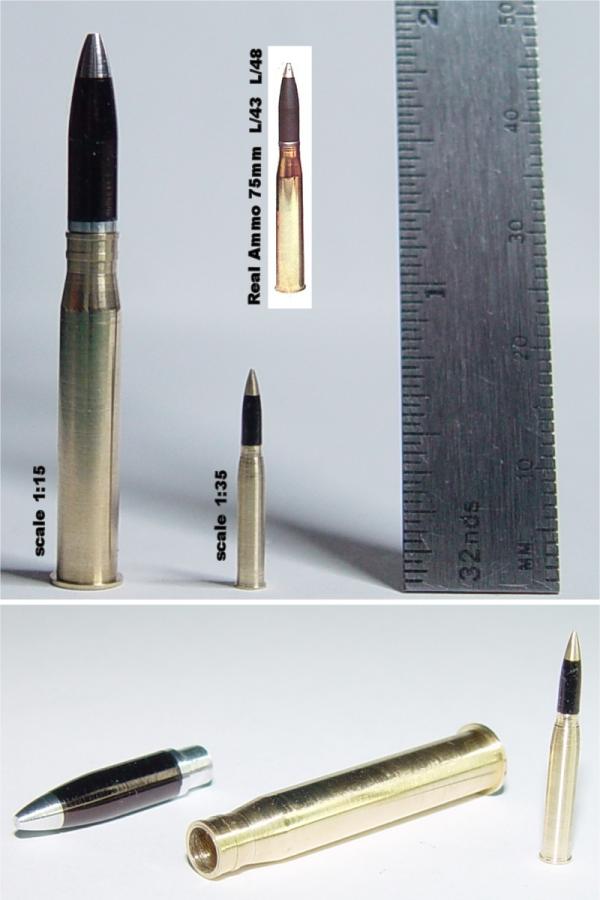 Je voulais m'essayer à faire des munitions. Celles-ci sont pour le canon de Panzer IV précédent. J'ai essayé de fabriquer à l'échelle 1:15 aussi fidèlement que possible en ayant seulement comme référence une photographie que j'ai trouvé sur ce site TONY WILLIAMS' AMMUNITION PHOTO GALLERY (en Anglais seulement)