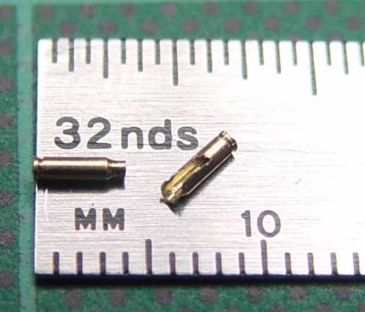 Longeur totale environ 6mm (1/4"). L'astuce d'utiliser une barre de laiton plus grosse semble être une nécessité. De la barre de 1/8" pliait sans arrêt, mais une barre bien plus grosse de 1/4" a permis de faire le travail sans trop de difficultées.