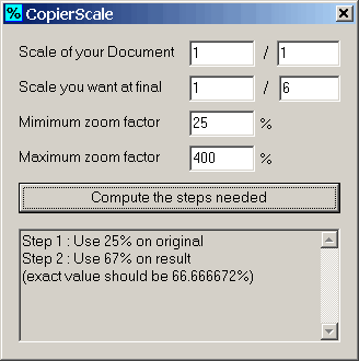 Vous voulez reduire le document 6 fois, en utilisant un photocopieur avec une limite de zoom de 25%-400%. Cela peut être fait en deux temps; Premièrement, réduire votre document de 25%, puis prendre le résultat et le réduire à nouveau de 67%. Le programme indique un faible taux d'erreur, car le vrai zoom aurait du être 66.666672% et pas 67%, mais les photocopieurs ne sont pas SI malins.