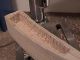 The pictures of this process are presented in chronological order. The pictures show the hull halves at various points in their carving and shaping. One picture shows the rough carved one hull half with the other just cut on a bandsaw to the outside major lines. The other shows one hull half rasped and rough sanded a little closer to shape to establish the proper exterior contours. When the other half is carved I will put them together (I have fitted dowels to the interior) and finish the shaping as a whole unit.