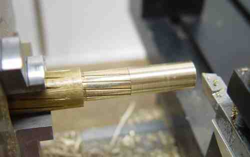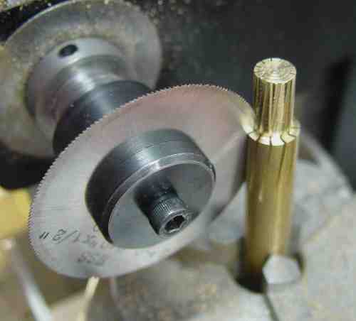 Tout d'abord, des rainures sont coupées dans une barre de laiton, à un angle de 5°. Il y a deux rainunes en fait, une est à raz de la surface et un peu plus large que celle qui est fine et profonde. Le but est d'augmenter un peu la largeur autour de chaque ailette.