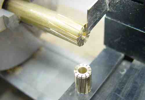 Après avoir coupé les rainures, le cylindre est percé puis séparé de la barre.