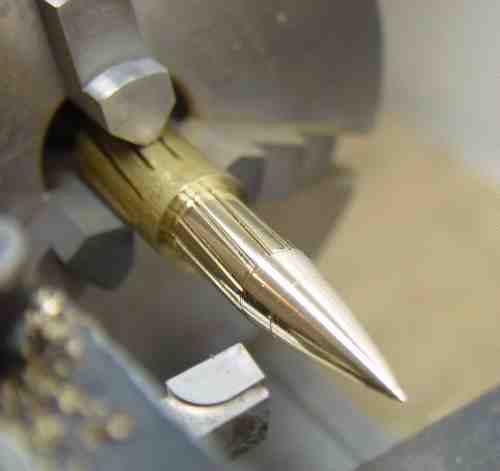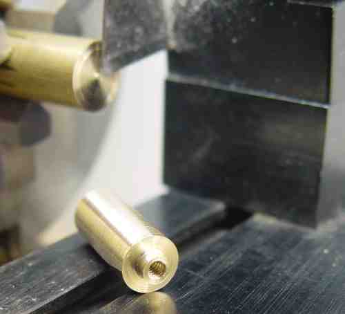 Après avoir désassemblé le nez et le cylindre central, la base est finalement coupée à sa forme finale et séparée de la barre
