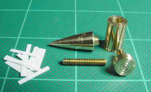 Le machinage fut facile, mais trouver une façon de faire les ailettes beaucoup moins. J'ai beaucoup expérimenté avant d'être capable de trouver une solution. En fait, 8 munitions furent fabriquées, mais seul le résultat final mérite d'être photographié ;-)