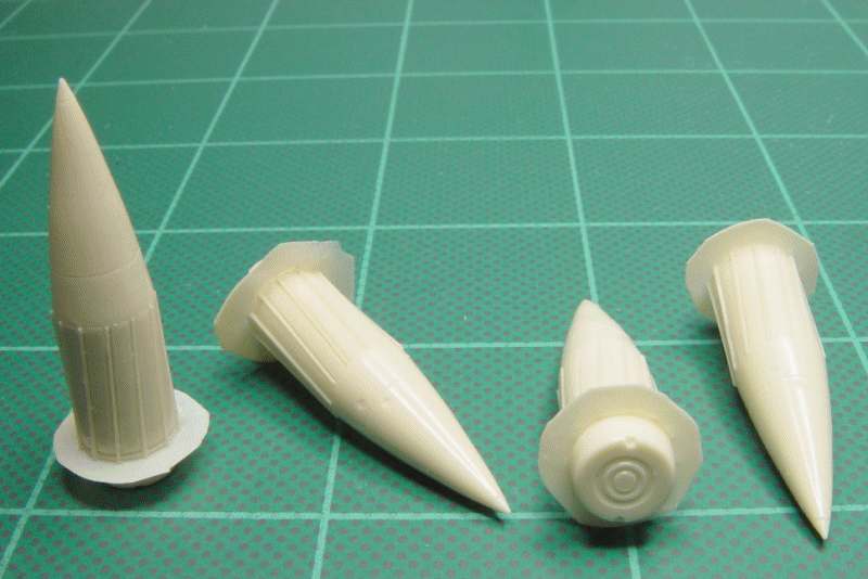 Voici le détail des ailettes. Vous vouvez voir que l'ailette est plus large à sa base. La petite rainure un peu plus large que j'ai ajouté devrait rendre le travail de peinture plus facile, tout en simulant cette forme faite d'un matériau différent du corp de la munition et aussi précisément que possible.