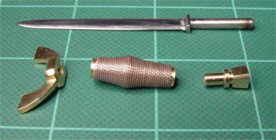 Voici les différentes parties, avant assemblage. La garde et le pommeau sont fait de laiton, le manche de fil de cuivre étammé. La lame est faire d'acier trempé (trempage à l'huile).