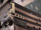 Once the whole balcony was sheathed in card, the entire surface was coated with CA glue and sanded smooth. Any gaps were filled with plastic model putty and rubbed down as shown in the picture below. Once all visible gaps were filled, the whole balcony was painted black.